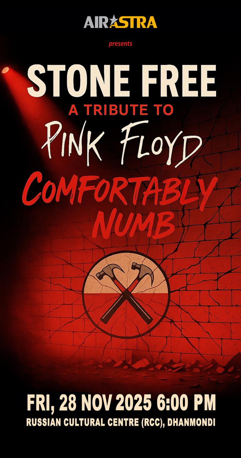 After their monumental concert at Hatirjheel Amphitheater in 2023 with their usual synchronised audio-video effects, Stone Free will perform 1.5 hours of Pink Floyd’s songs live at the newly refurbished Russian Cultural Centre (Russia House) in Dhanmondi on Friday, 28th November 2025.